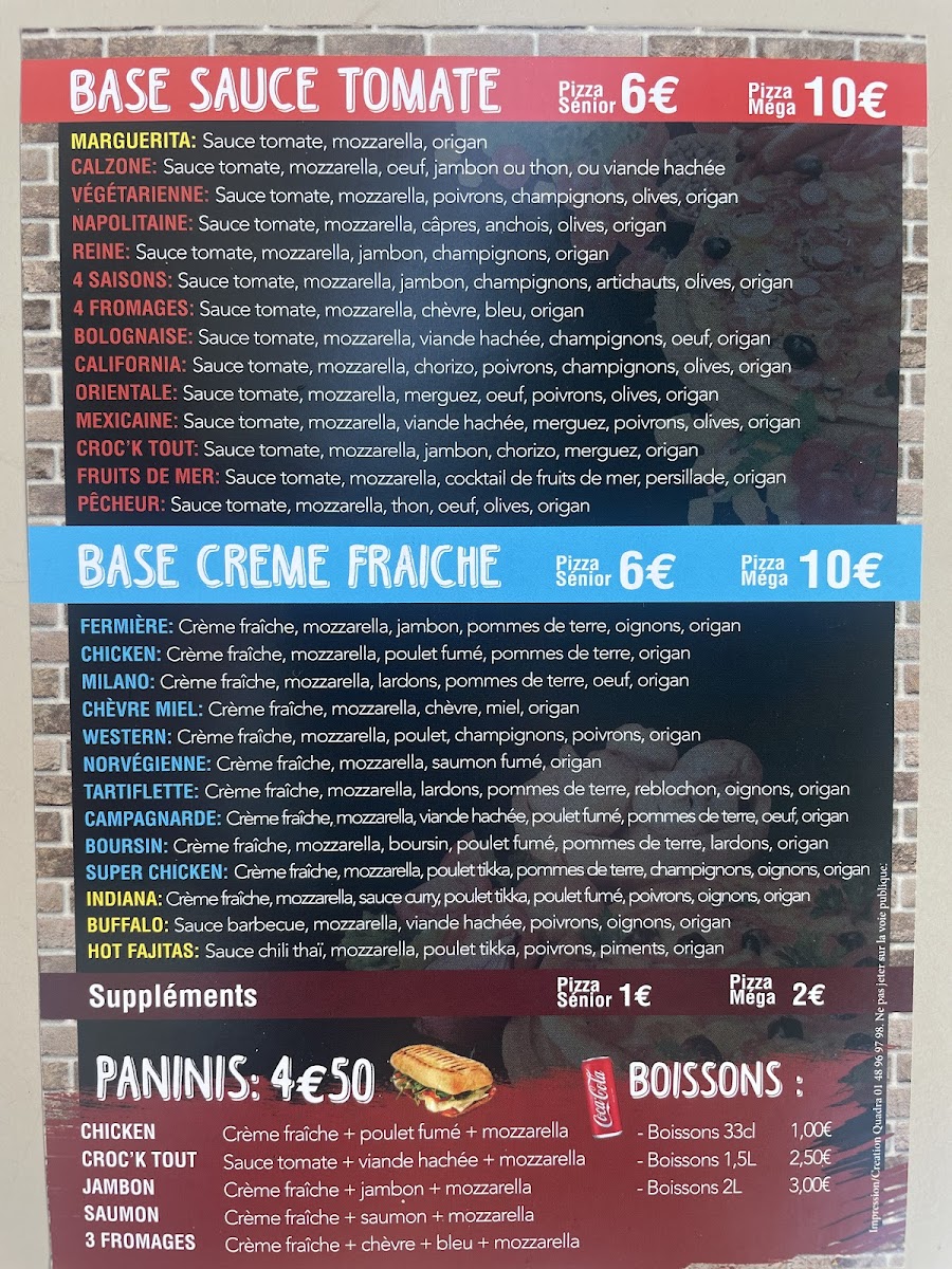 Introducing the menu at Crock Tout Pizza, located in Drancy, France, is a culinary experience that promises to delight pizza lovers. Renowned for its authentic flavors and fresh ingredients, each pizza is crafted with care, featuring a beautifully crisp crust that perfectly balances generous toppings. Customers rave about the incredible quality, citing it as "imbattable pour le prix" (unbeatable for the price), highlighting both the affordability and the speed of service.